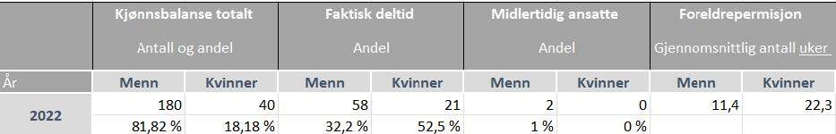 Selskapet har som målsetting å rekruttere flere kvinner i lederstillinger med personalansvar. I 2022 hadde vi en kvinneandel på 41 % i disse lederstillingene.